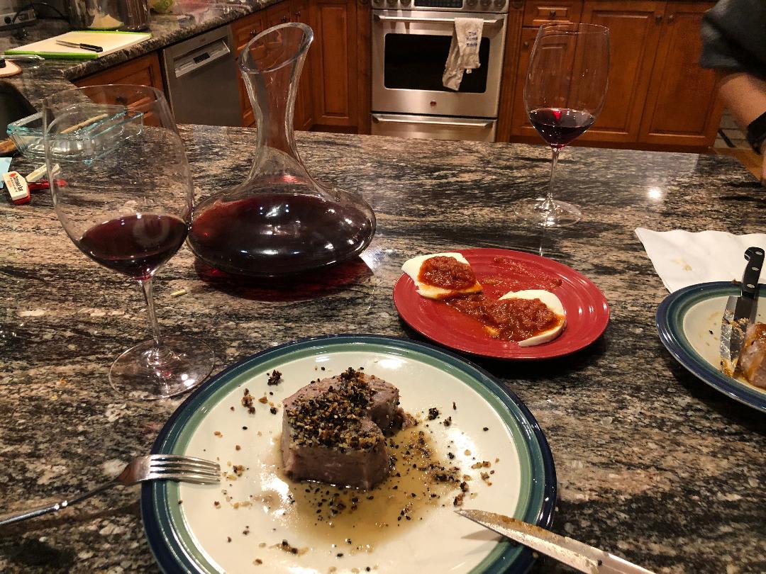 We started with a three hour decant to kick things off. Our food pairings were sous vide tuna steak and fresh mozzarella with tomato sauce.