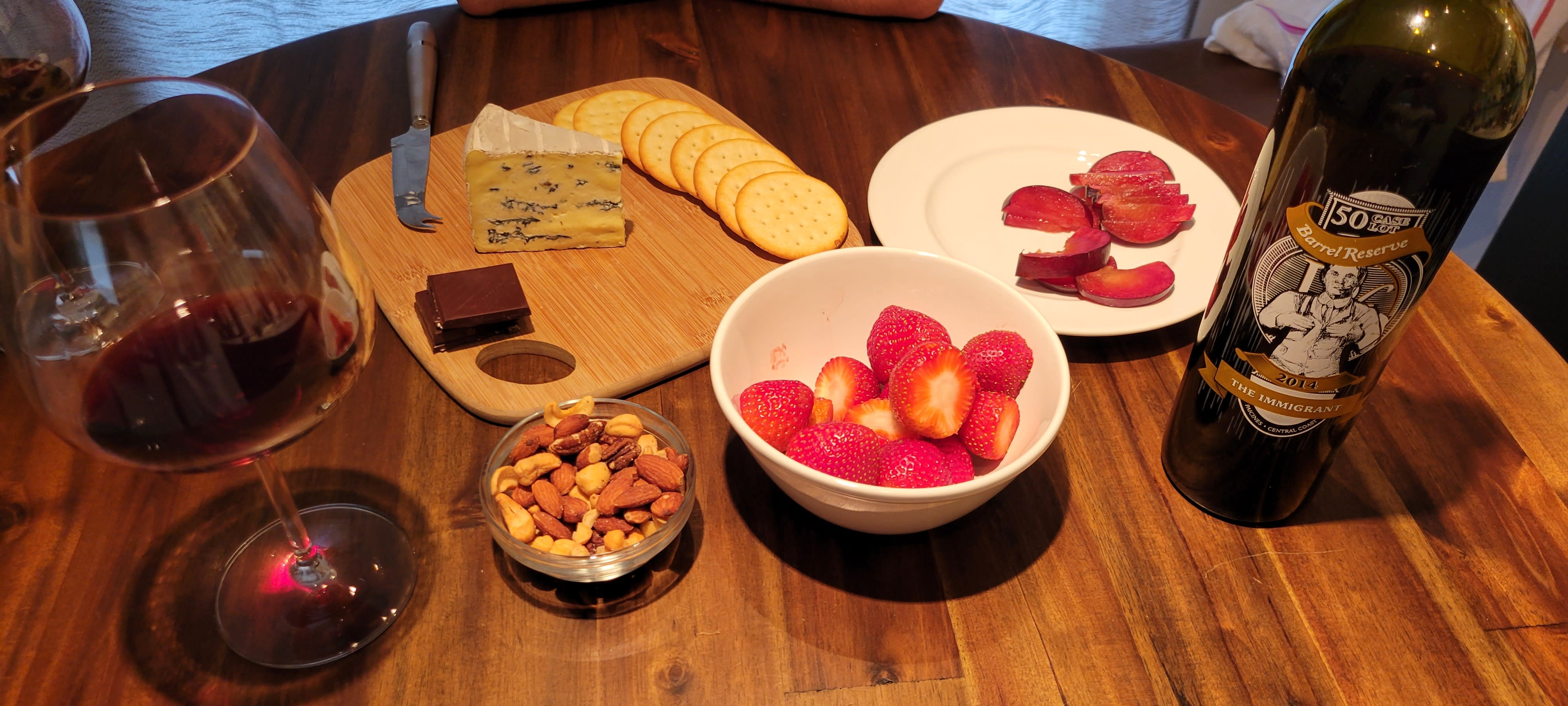 Of the snacks on hand, I think the fresh strawberries and the dark chocolate were the best pairings. Both brought out some tartness in the wine which cut right through the sweetness of the strawberries and the richness of the chocolate.