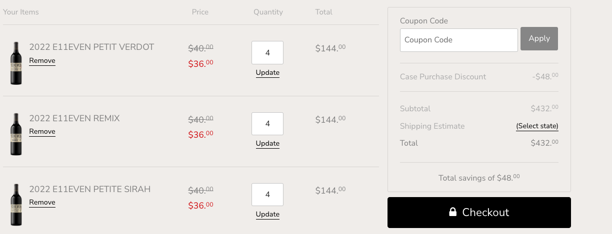 $432.00/Case for 4x 2022 E11even Petit Verdot, Santa Ynez Valley + 4x 2022 E11even Petite Sirah, Los Olivos District + 4x 2022 E11even Remix Blend, Santa Ynez Valley at Andrew Murray Vineyards