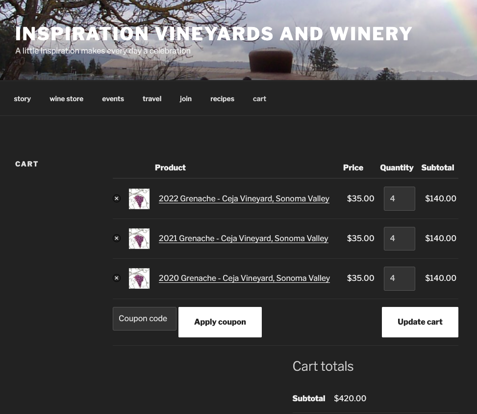 $420/Case for 4x - 2021 Inspiration Grenache, Sonoma Valley, 4x - 2020 Inspiration Grenache, Ceja Farms, Sonoma Valley, Sonoma County, and 4x - 2022 Inspiration Grenache, Sonoma Valley, Sonoma County at Inspiration Vineyards