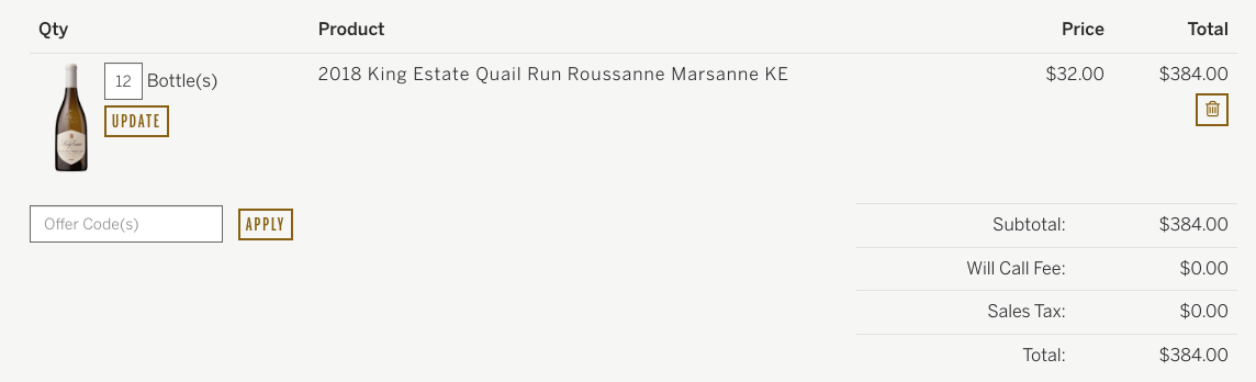 $384.00/Case for 12x 2018 King Estate Roussanne-Marsanne, Quail Run Vineyards, Rogue Valley at King Estate Winery