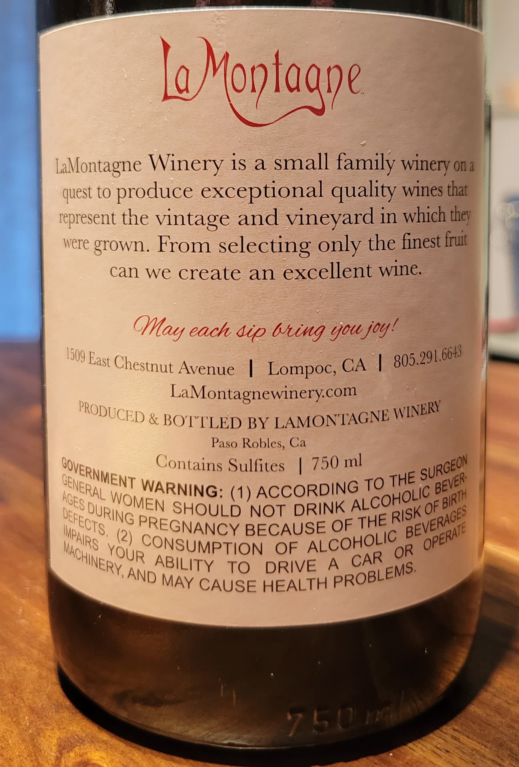 2015 LaMontagne Pinot Noir, Quinta del Mar Vineyard, San Luis Obispo County