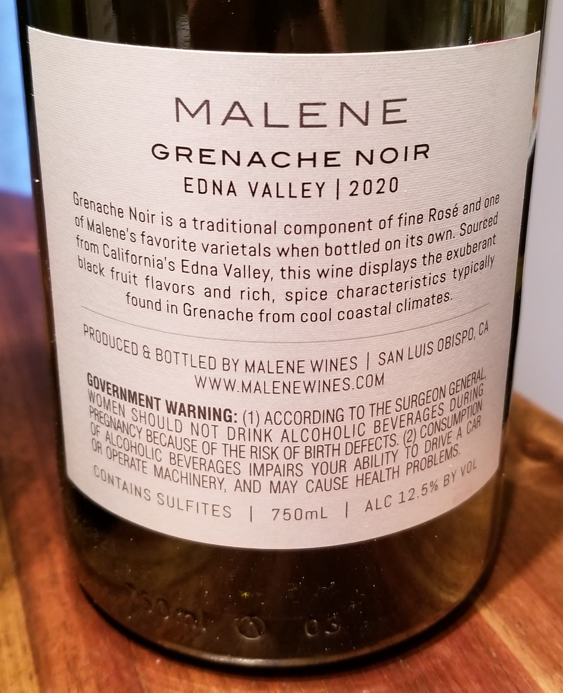 $276.00/Case for 12x 2020 Malene Grenache Noir, Edna Valley at Malene