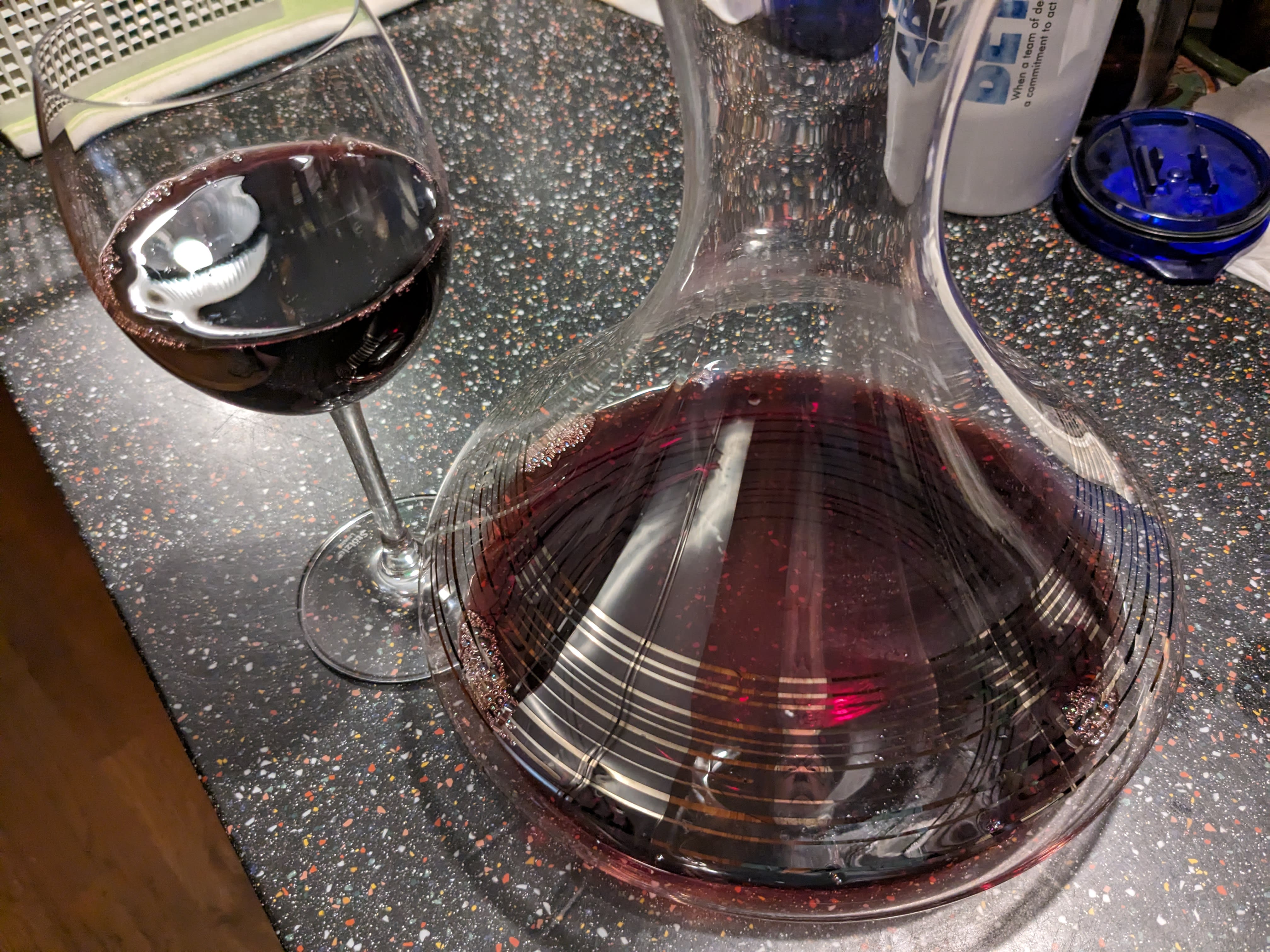 Arrived at 5 PM, goes on sale in 7 hours, so glug glug glug into the decanter to let it settle down from travel and coax as much out of it as possible with limited time for rattage.