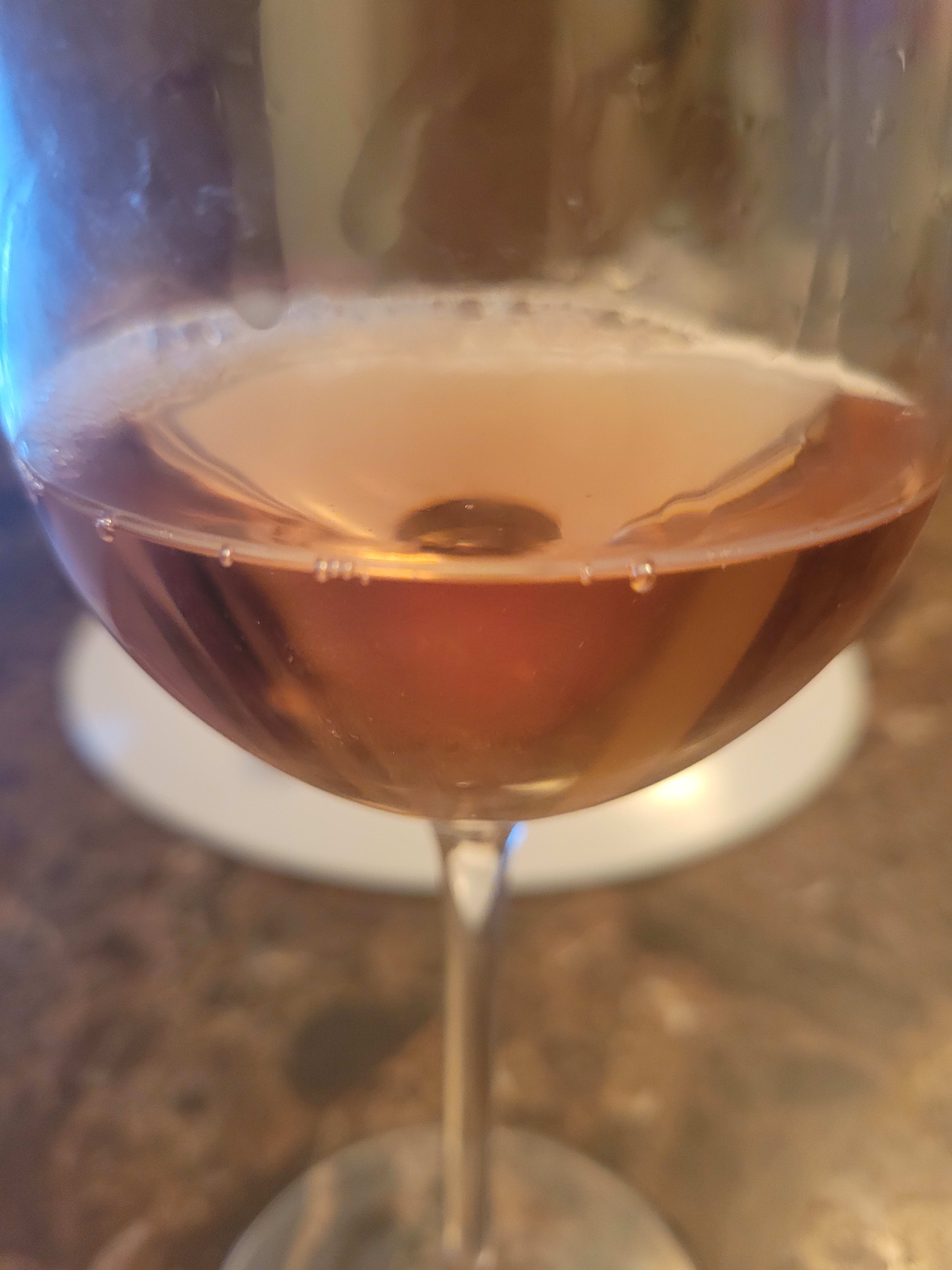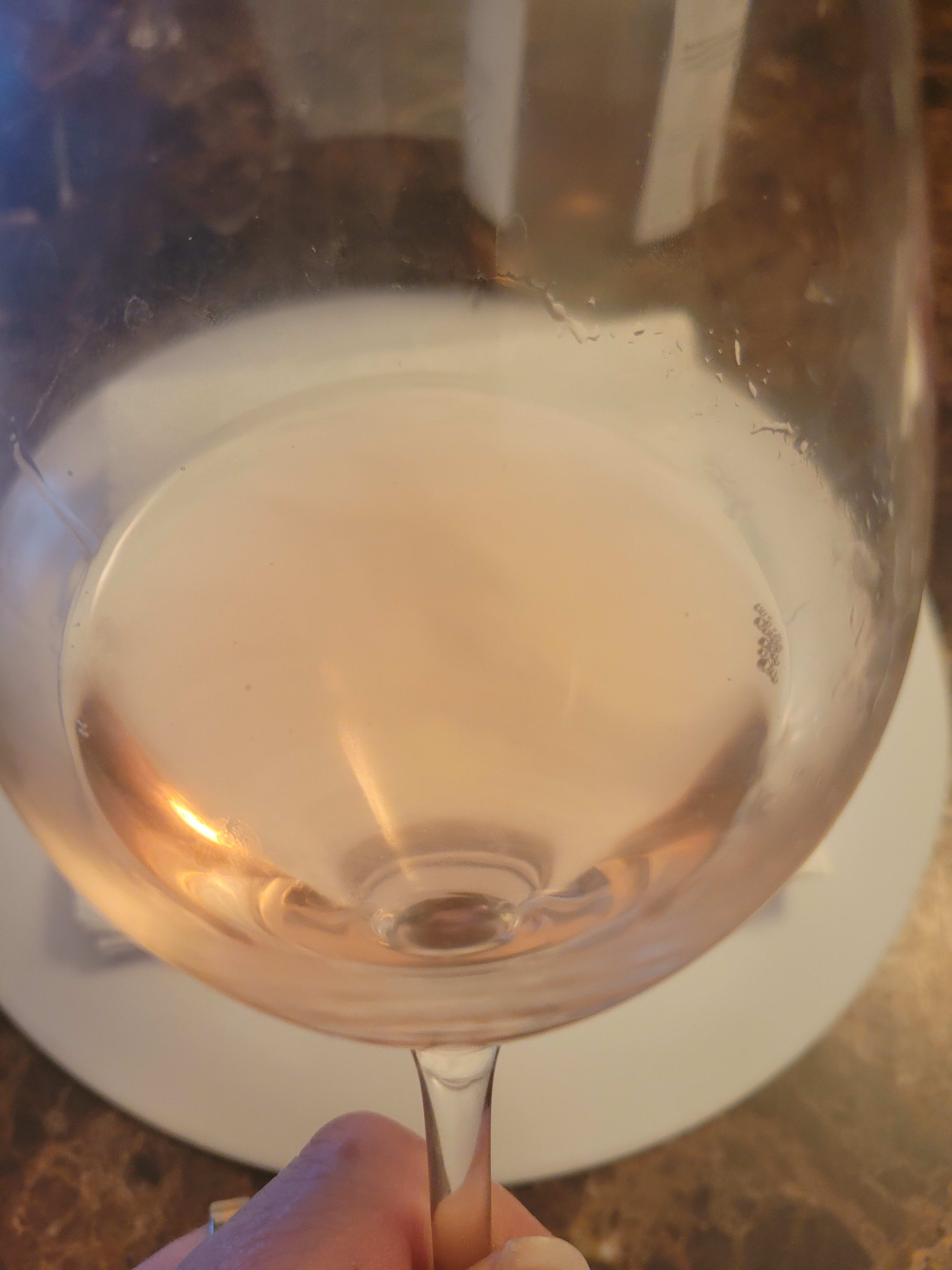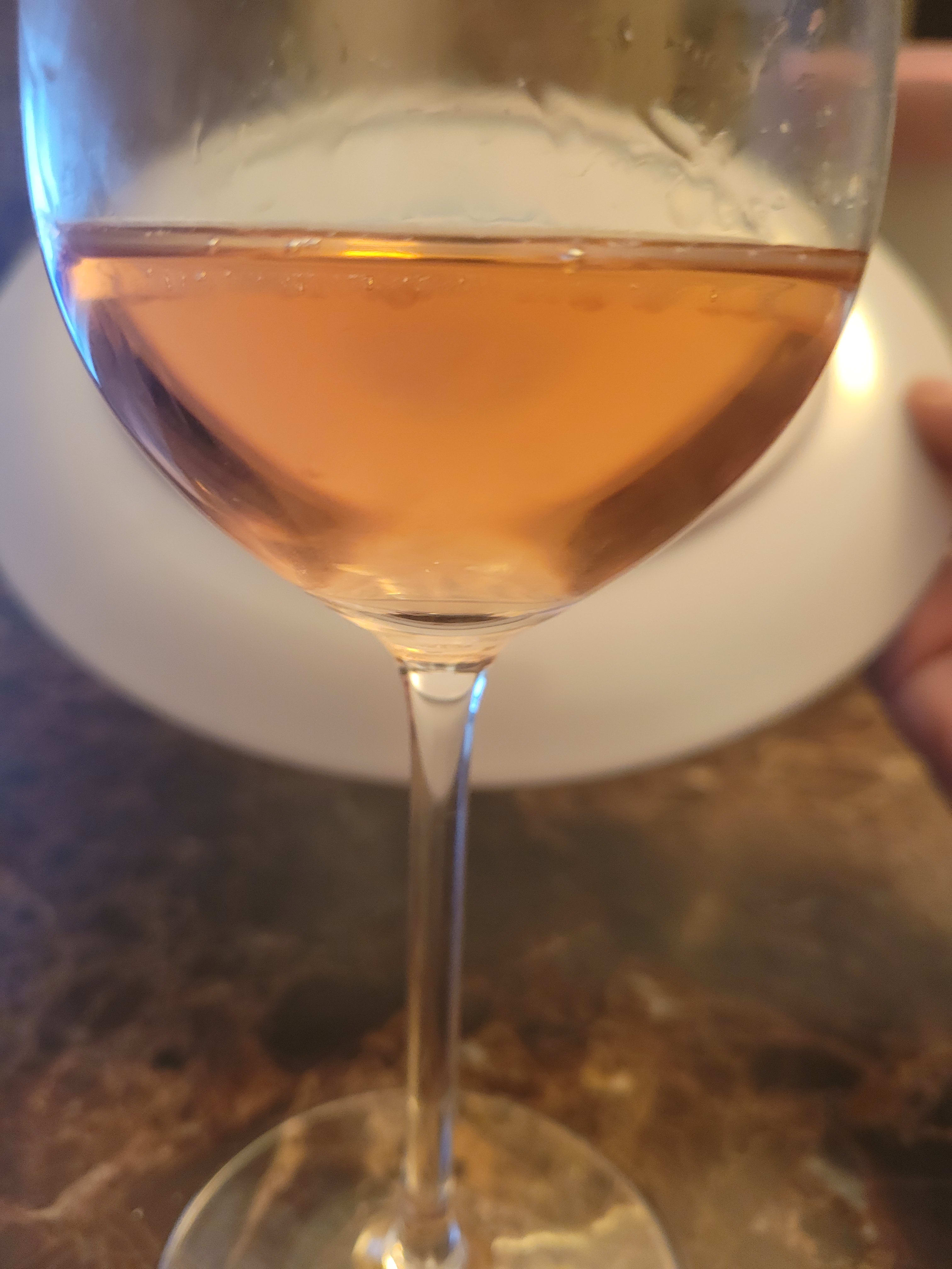 Started with the bottle pretty cold since we were going to be outside at about 93 F degrees. On pop and pour, not a lot on the nose, little bit of fruit, nothing discernible, maybe a bit too cold. First taste, bright and a bit tart. We notice it is a little oily or buttery on the roof of the mouth, got a bit of apple/peach and a lot of acidity on the finish. Has a little more going on than the average rosé I would say. As it started to warm up, it seemed to lose the taste of fruit and seemed a bit sweeter but more tart.