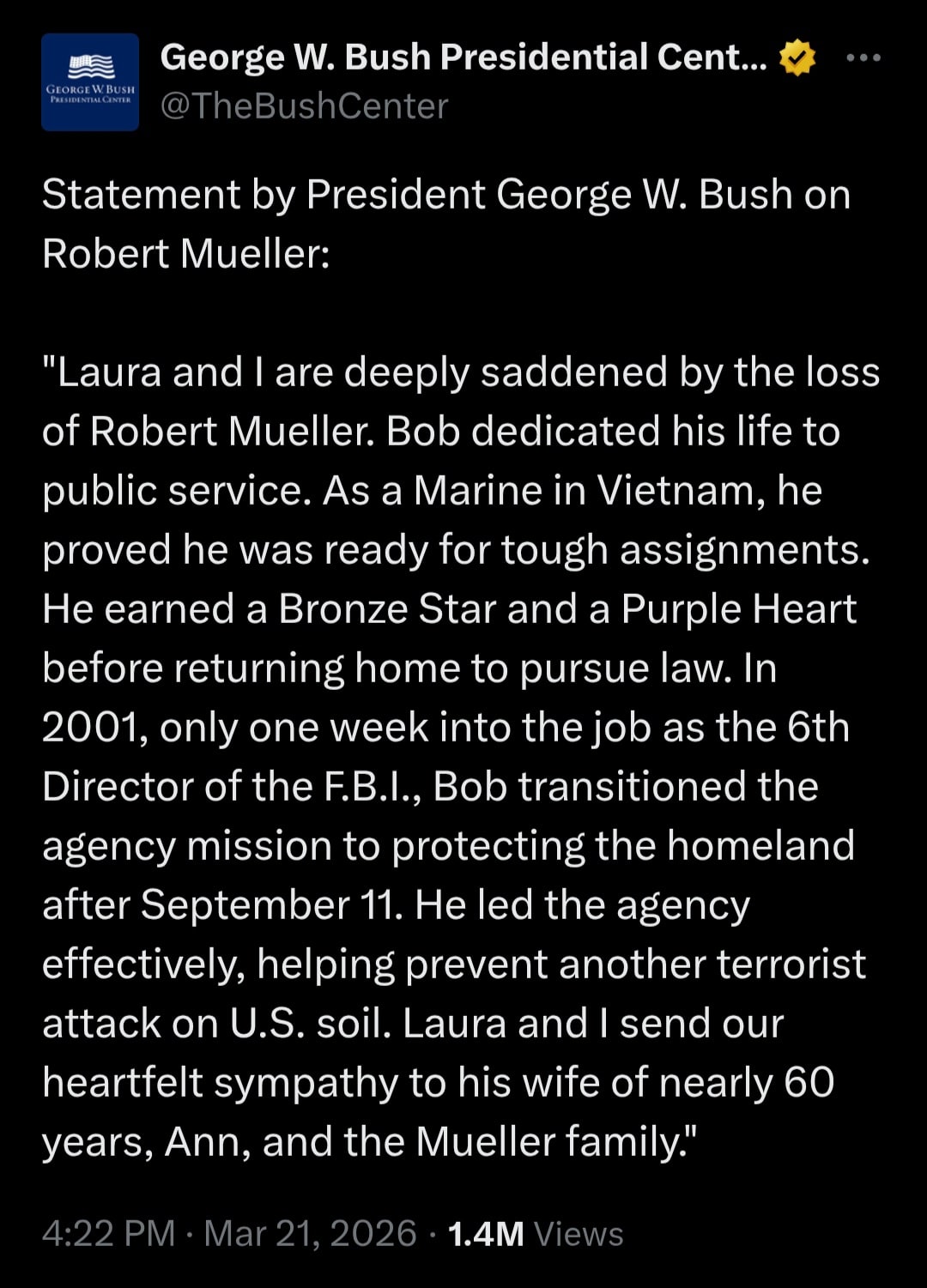 Robert Mueller was diagnosed with Parkinson’s disease in the summer of 2021. He died this past Friday, at the age of 81.