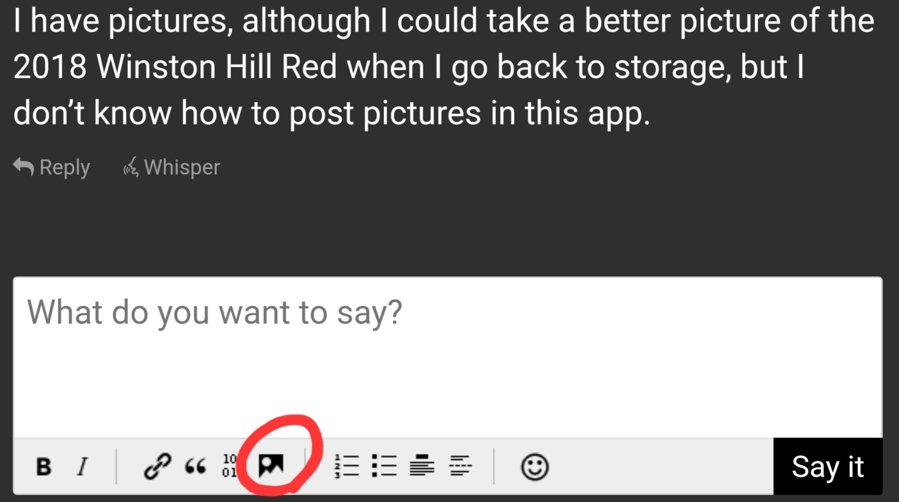 I have pictures, although I could take a better picture of the 2018 Winston Hill Red when I go back to storage, but I don’t know how to post pictures in this app.