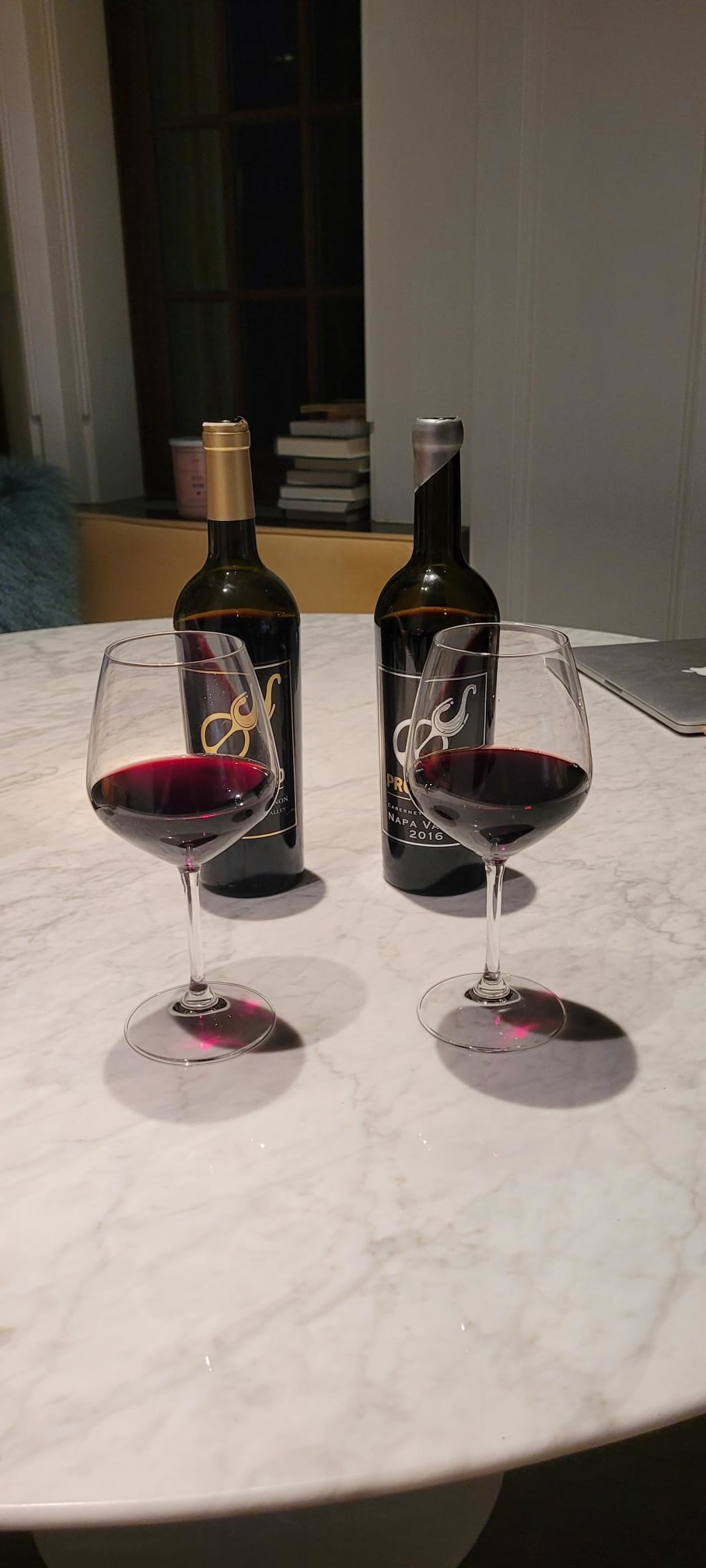 The Prohibido 2016 on the nose was more red fruits such as raspberries, with a background hay-like note, the way some people describe saffron. On tasting, we noted blackberries, smoke, leather, a fair bit of acid, and “warmth,” with a moderately long finish. Although on PnP there was some classic Cab bell pepper, that mellowed out along with the tannins by our second and third tastings, replaced with cherry cola and dried fruits, along with perhaps some ancho chile. It paired especially well with our dinner venison steak au poivre (i.e., I ground a fistful of pepper into some leftover gravy), and with a well-aged mimolette cheese.