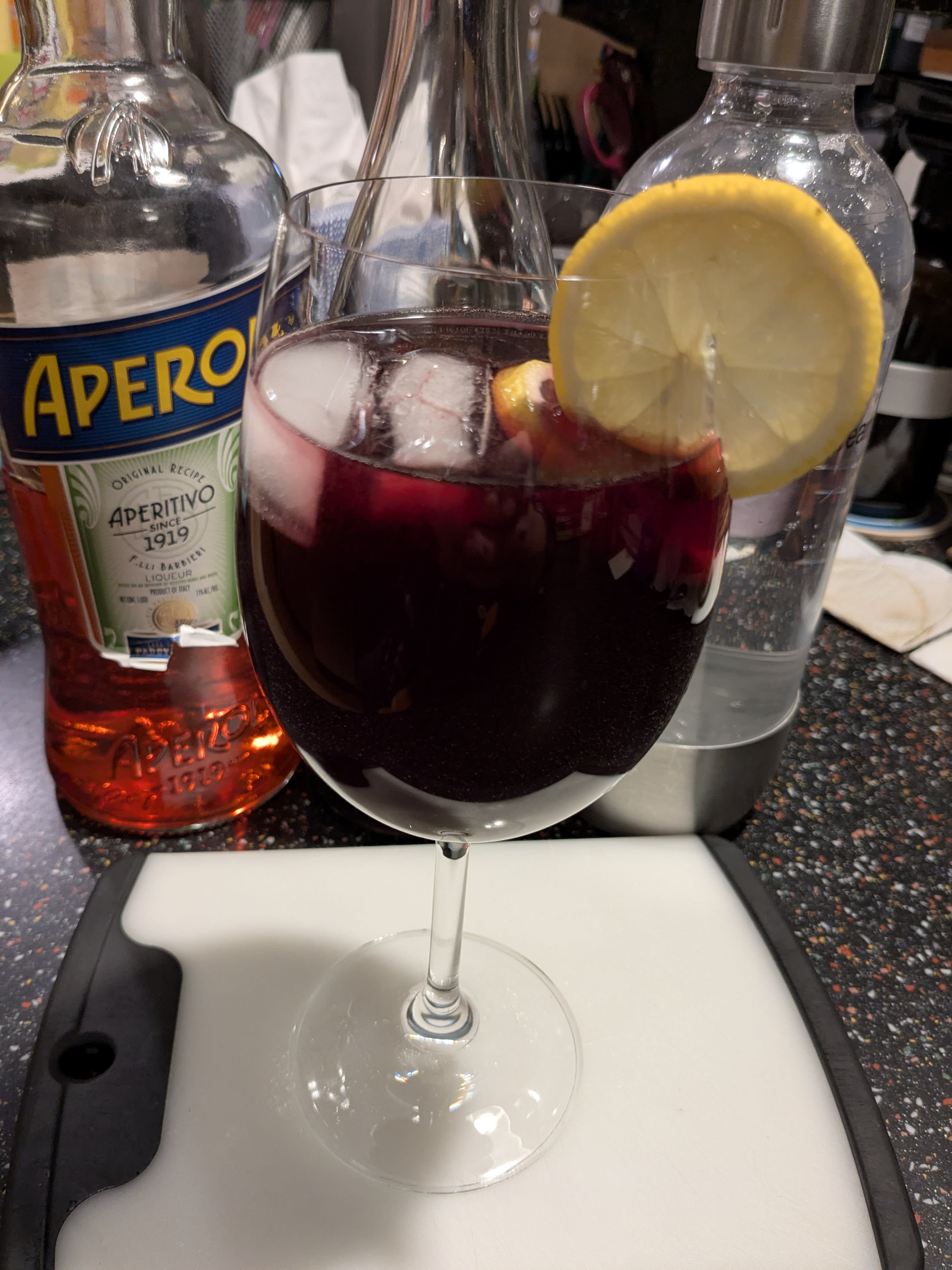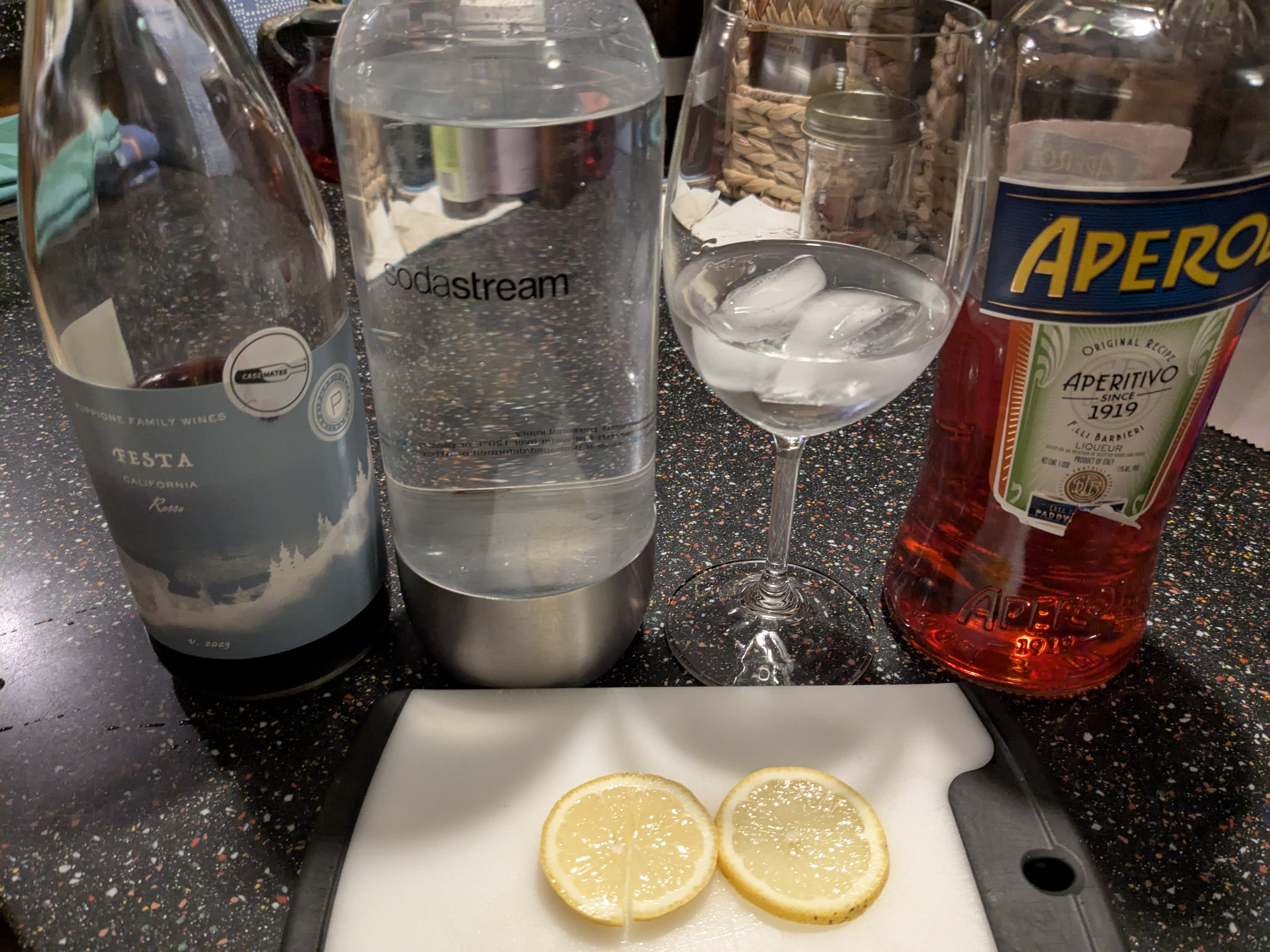 OK, I did it. A big pour of FESTA Rosso, gin (yeah that’s me), Aperol (because dammit, I’m out of Campari), and some seltzer. And lemon, because I’m all out of oranges, having just made Cara Cara marmalade earlier today. Pretty darned tasty! Honestly, I think the winery would approve.