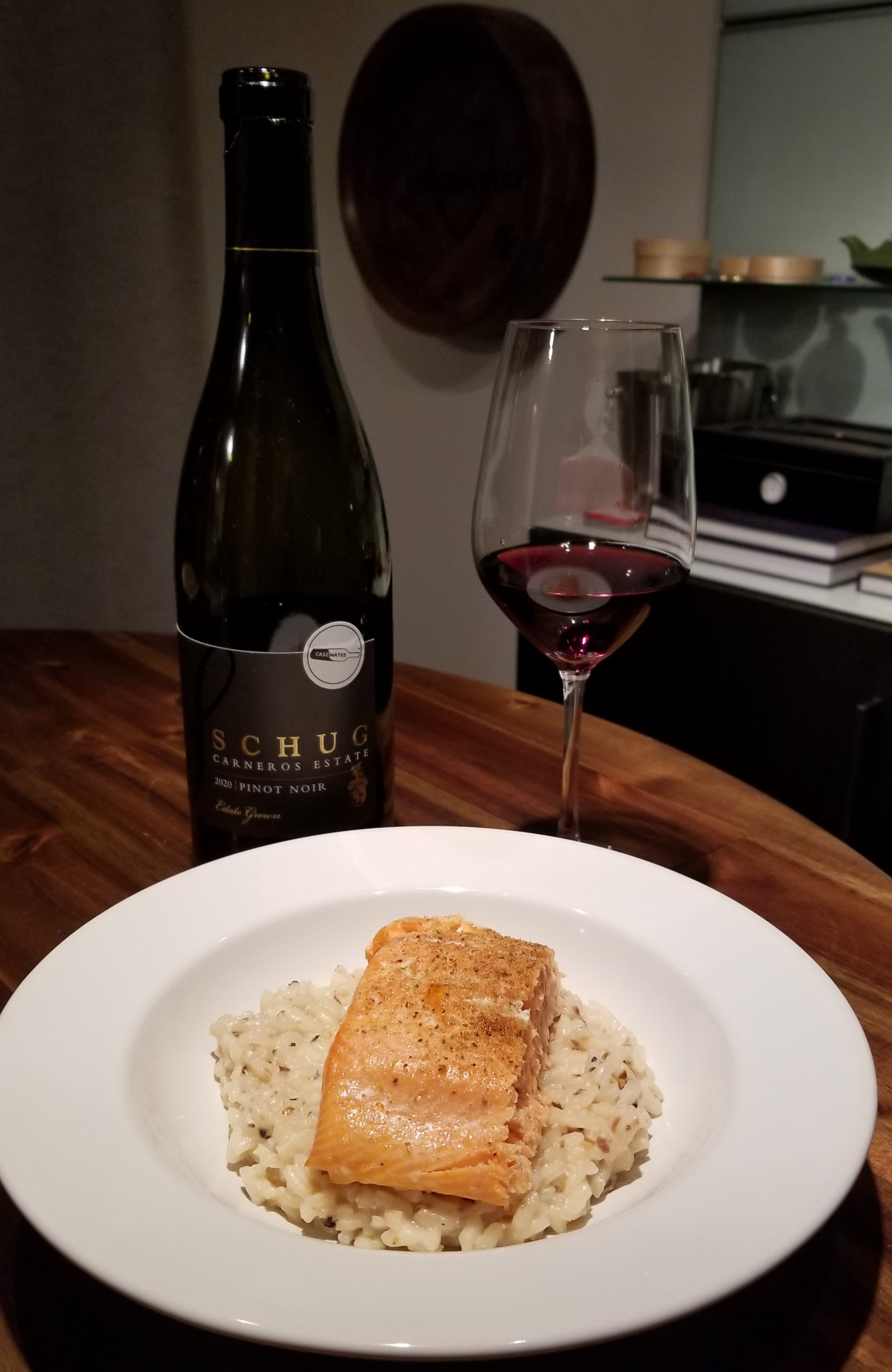 Dinner consisted of coho salmon on a bed mushroom risotto. It was a perfect pairing. The wine held its own and complimented the meal.