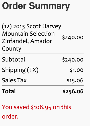 The listed cost from Scott Harvey direct is much lower than usual because Scott is currently running a 20% off a case order with $1 shipping. I would say the cost of buying a case of this zin direct would usually be well over $300 with shipping. This is a killer deal by the case, and even cheaper than the last WineWoot killer case deal on this wine. Crazy!