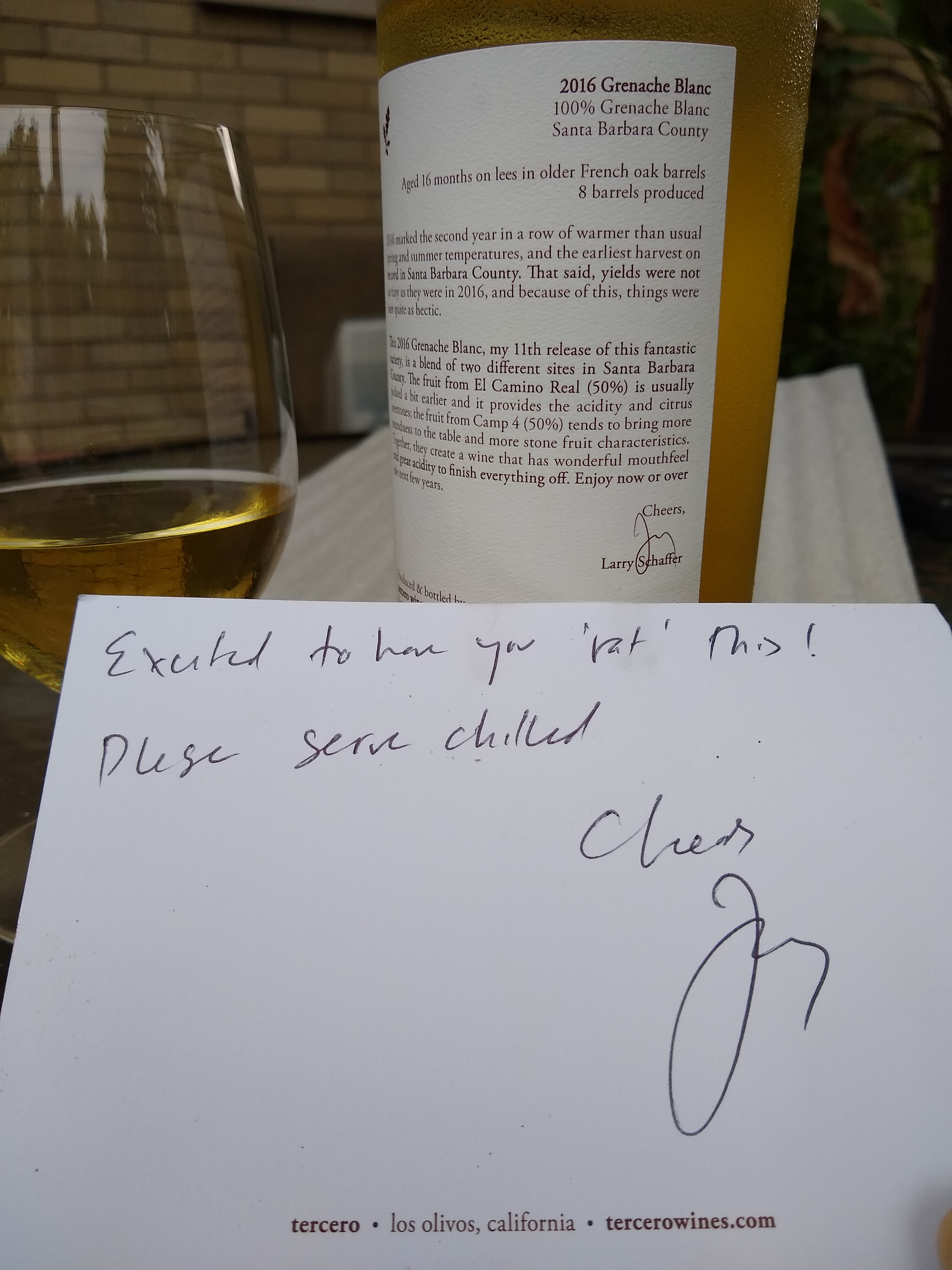 I was excited to see the UPS shipping memo “TERCEROGRENACHE” … finally, a red after the last two lab rat whites! But it’s a white after all! Not that I mind. Lord knows I love a good Rhone-style white wine.
