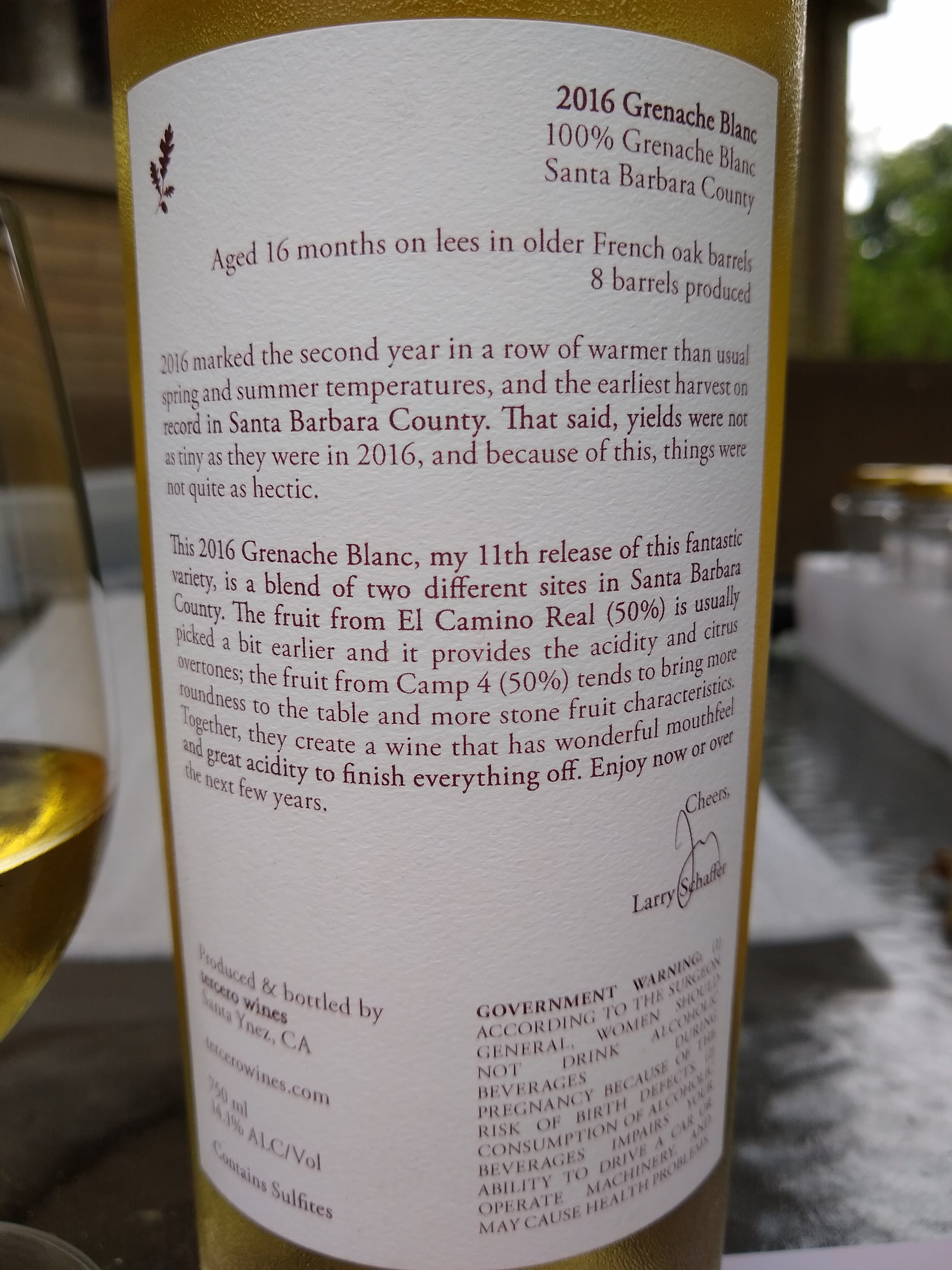 Winemaker Larry said to “served chilled” (signature verified!) but I found this really started to bloom at 60°F to 65°F. (This is not the usual advice for grenache blanc.) It also tasted best outside on the patio on a balmy 85°F evening.