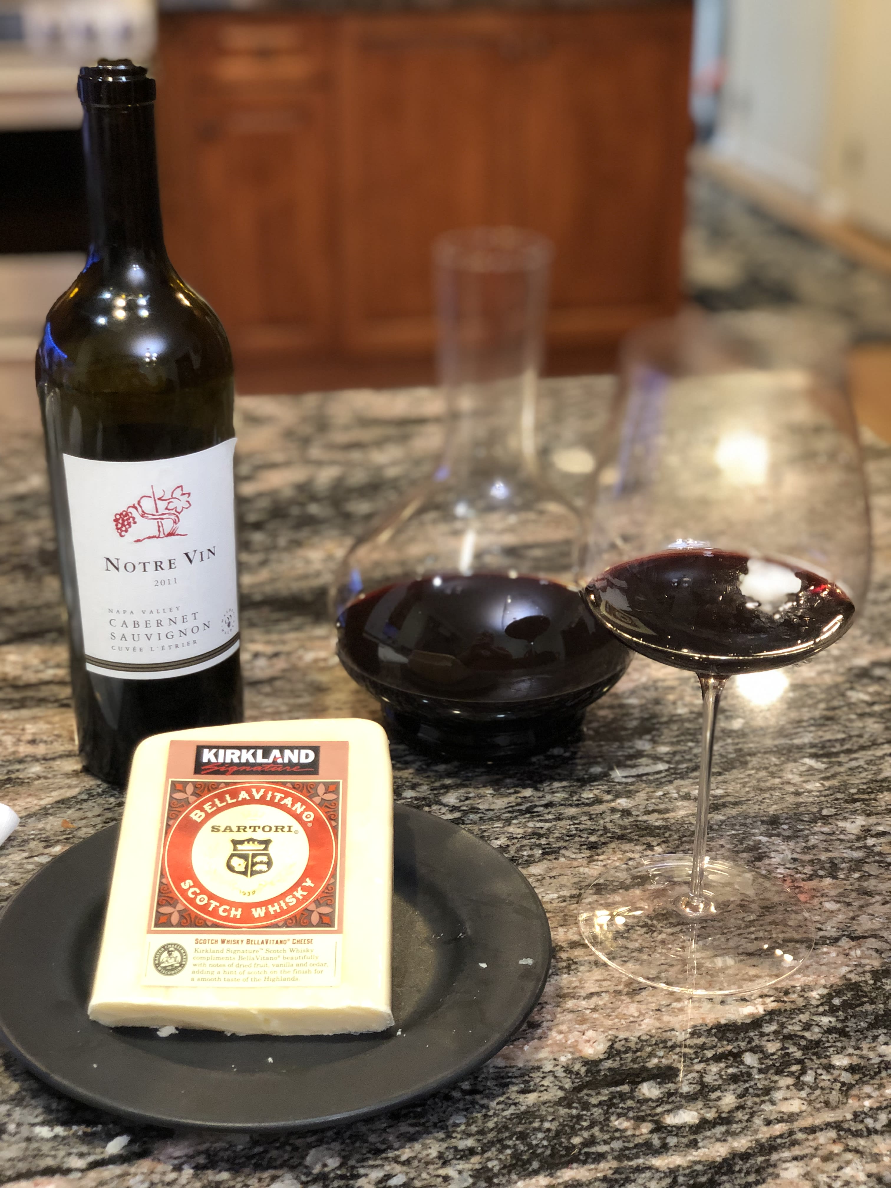 As promised… 2011 Notre Vin Cabernet cuvée l’etrier. Dinosaur bone ribeye will have to wait until tomorrow. Will have to make do with some Sartori Bellavitano scotch whisky cheese.