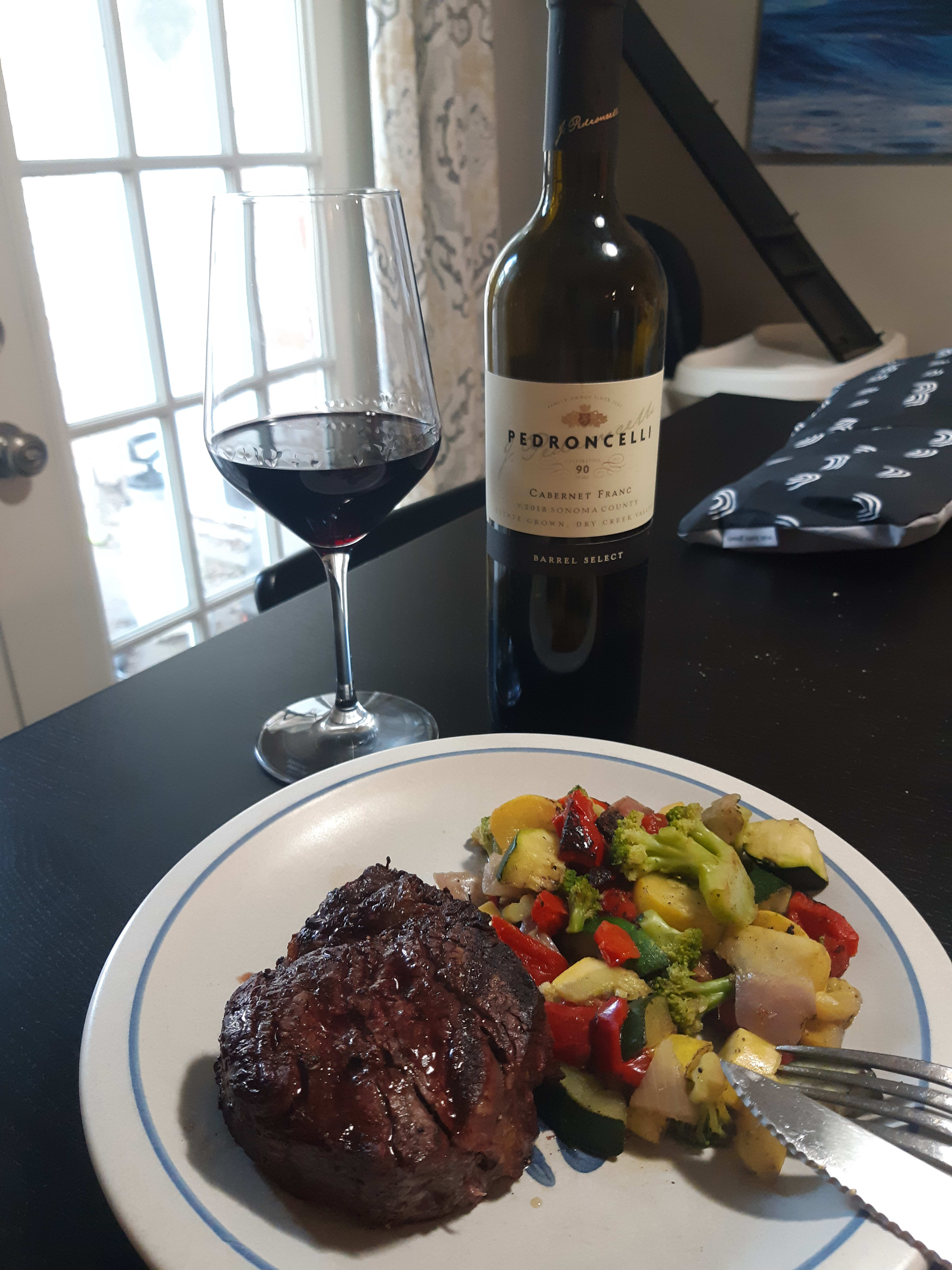 Some Costco filets on the grill with some roasted veggies and this cab Franc. I had stopped buying pedroncelli for a while because I never felt they lived up to the hype but this one is great.