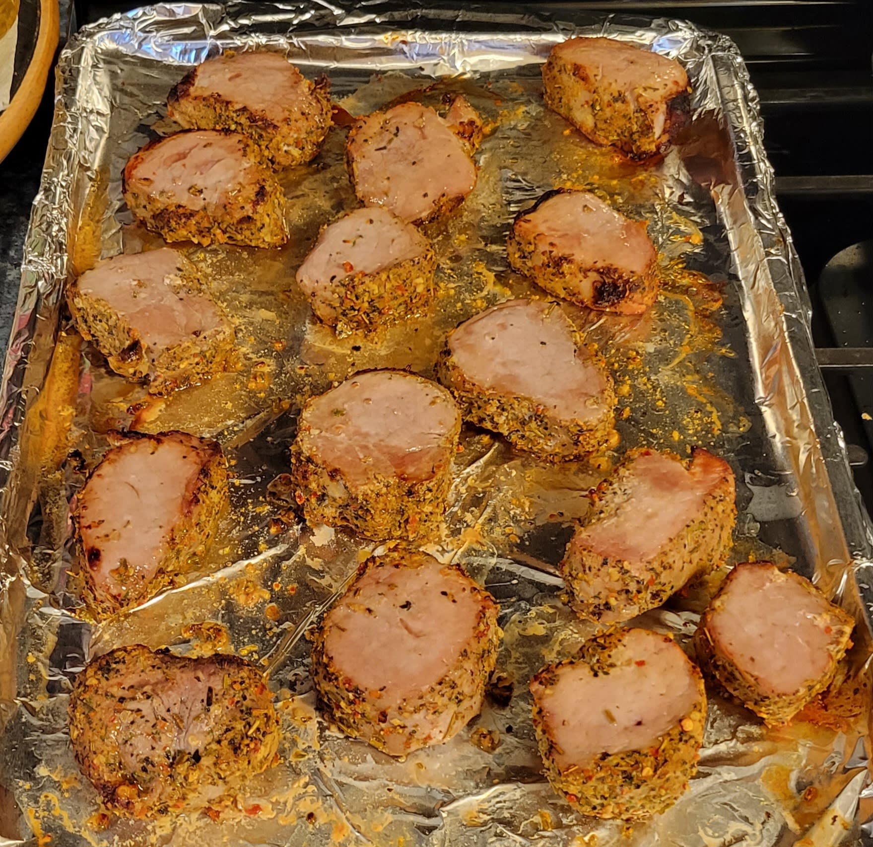 Mediterranean pork medallions from Costco. Not pictured, but also much enjoyed: ham, stuffing, bourbon glazed carrots, garlic knots, and Gruyère/Emmentaler AOP/Raclette fondue.