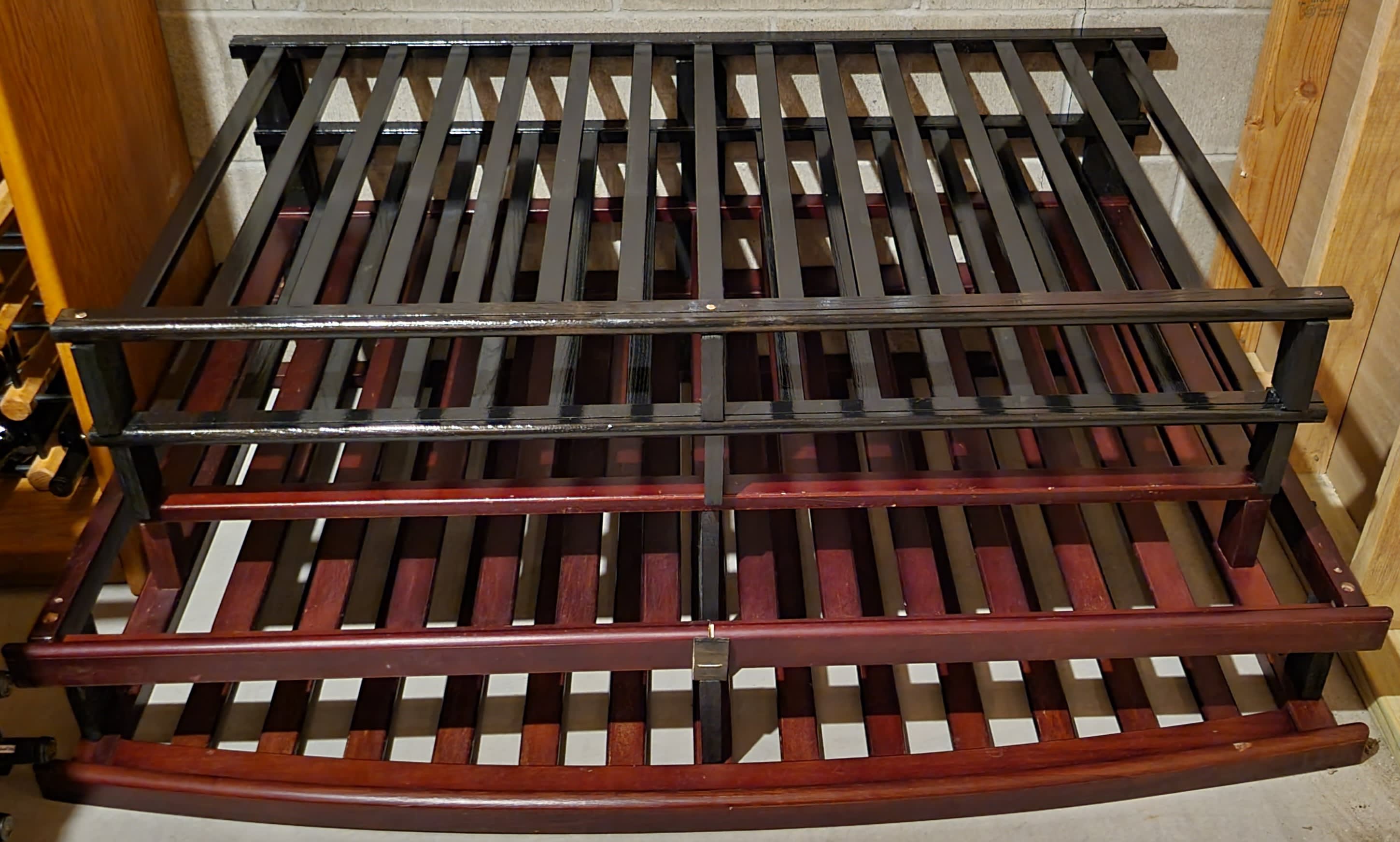 This is a wine rack I made with parts upcycled from a baby crib. It takes up more floor space, but it provides peace of mind knowing that the 136 bottles are relatively safe since the top tier is less than 22" from the floor.